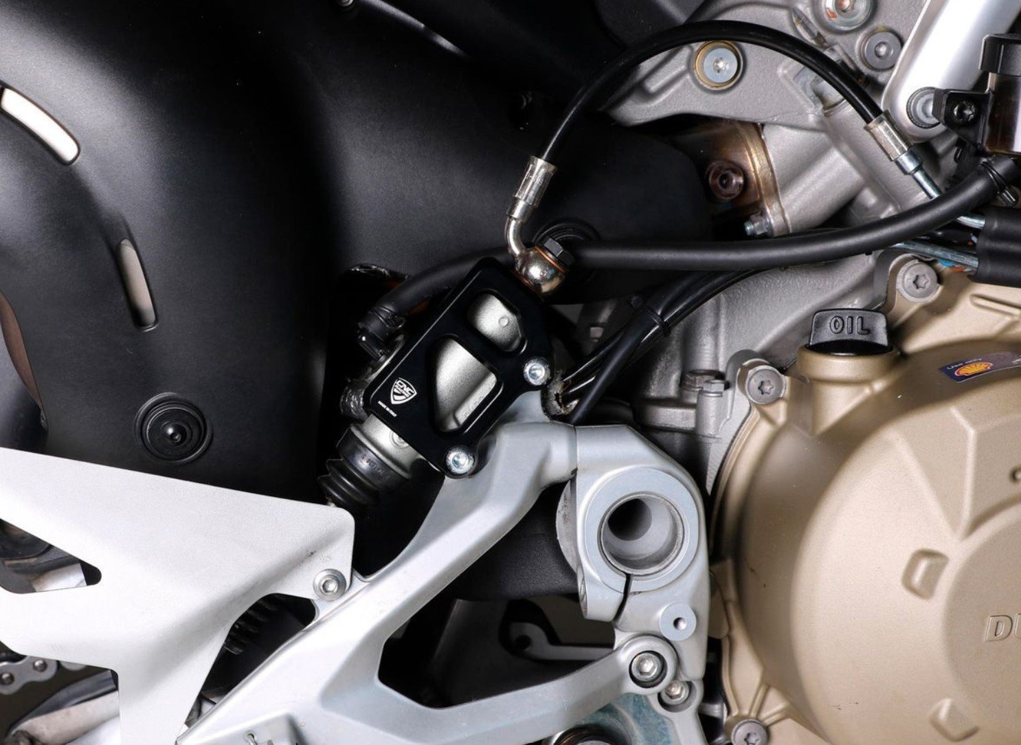 Master cylinder protection compatible with OEM footpegs.Ā Rear brake master cylinder protection machined from solid light alloy with subsequent surface anodization.