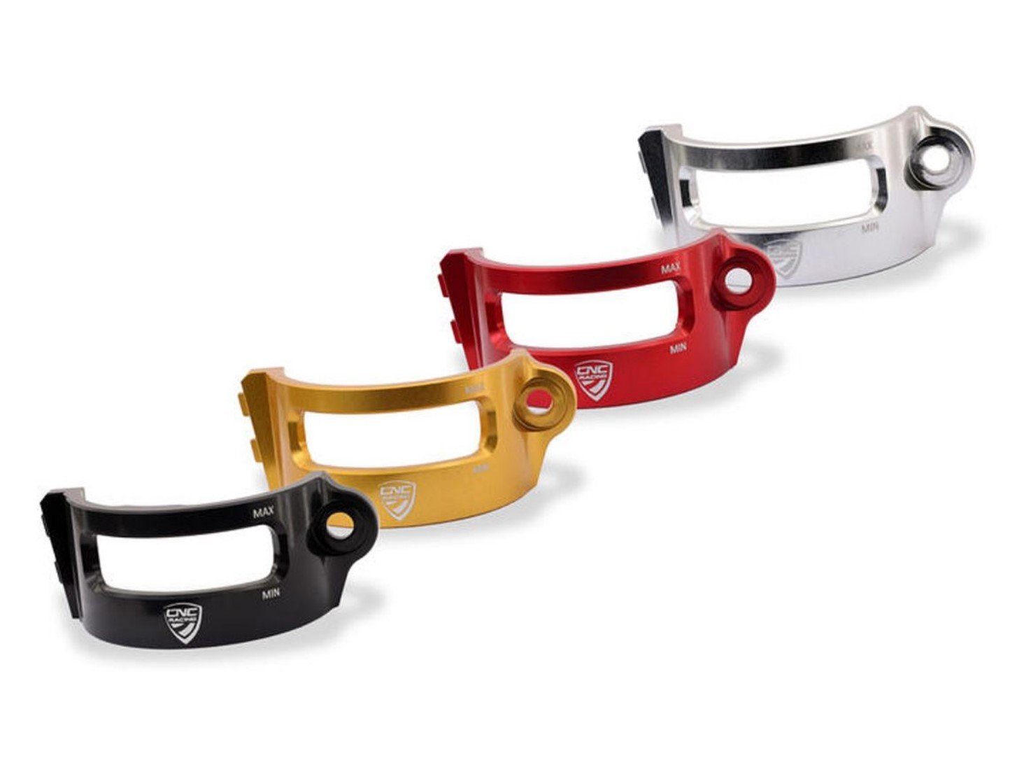 Half clamp for rear brake fluid tank of the Ducati Multistrada V4 made from a light alloy with subsequent surface anodized.