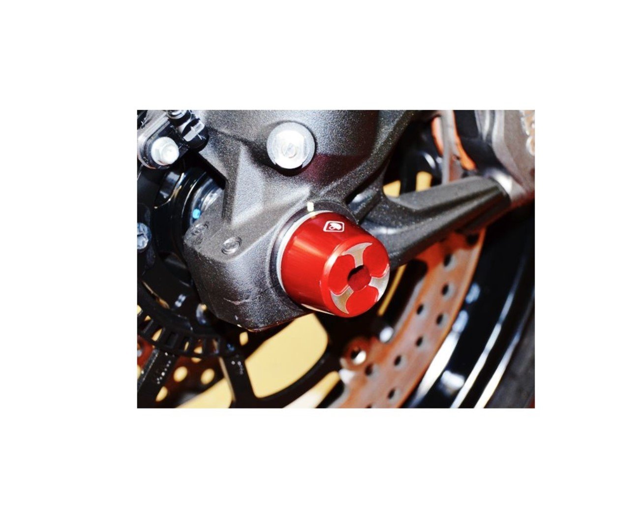 Worked by full aluminum 7075 t6, anodizing surface colored. Kit ready for assembly, assembly on the front wheel stud, protects legs fork in case of fall.Ā DUCABIKE designs, develops, manufactures and markets its products, based on experience in all the years on road and in racing to do every effort to give the maximum reliable and guarantee on products, find the design and the best performance, utilize support of our prepared technicians and the best test pilot, employing the best materials and the innovative technology in the motorbike world, this offer products always at the top.